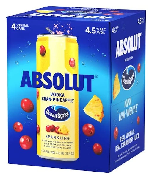 Absolut Vodka Ocean Spray Cran-Pineapple canned cocktails are inspired by the classic combination of Absolut Vodka and Ocean Spray Cranberry Juice. This iconic collaboration between Absolut Vodka and Ocean Spray delivers a ready to drink sparkling vodka cocktail with the refreshing taste of tropical pineapple and juicy cranberry in a convenient format that is ideal for sipping and perfect for sharing. These real cran-pineapple juice mixed drinks offer a sweet twist on the Absolut Vodka