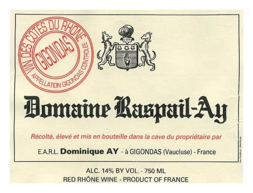 Domaine Raspail-Ay produces classic Gigondas wines. Full-bodied, fruity, fine and well-balanced. Aromas of red fruits – raspberries and black cherries – with notes of black pepper, lead to more complex scents of licorice and herbs de Provence. Tannins are ripe, the wine fills the mouth with warm, generous flavors yet with an underlying structure that bodes well for future po- tential. A fruit-forward and accessible wine, Domaine Raspail-Ay is an ideal wine for restaurants.