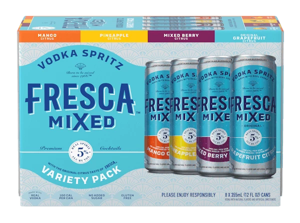 Original Grapefruit Citrus, Pineapple Citrus, Mixed Berry Citrus, and Mango Citrus All made with 4x Distilled Vodka with Fresca base 100 calorie, 5% ABV, gluten free, no added sugar